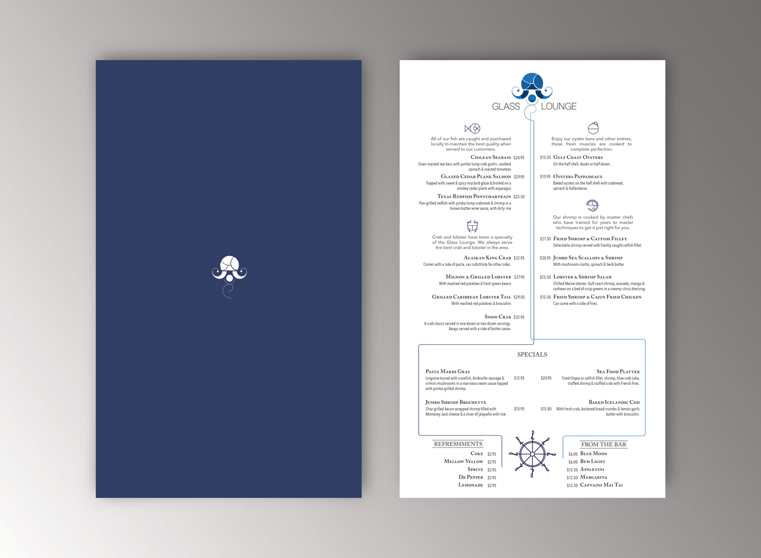 This is a larger image of the menu found in my corporate manual. The logo of the restaurant is the foundation of this design. What I learned most from creating this was that a solid foundation yields a much more effective design quicker and easier. I used the logo to draw the viewer's attention down the page utilizing the menu's unique shape. The same process was employed to make the logo in creating the icons used for the different food groups. This creates a sense of unity which holds the design together.